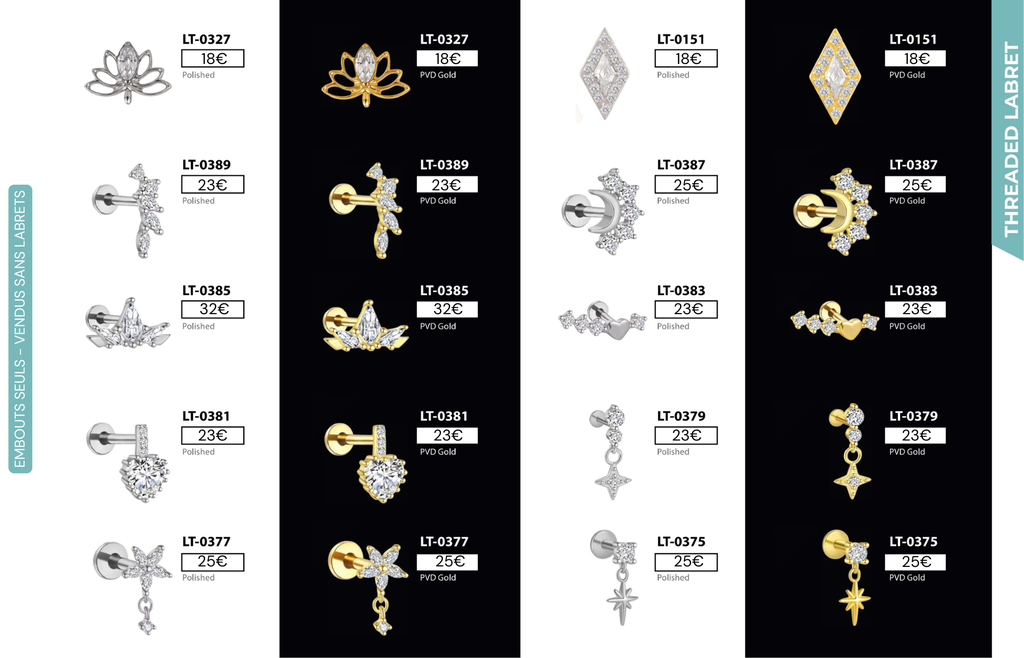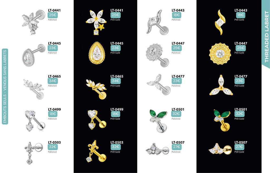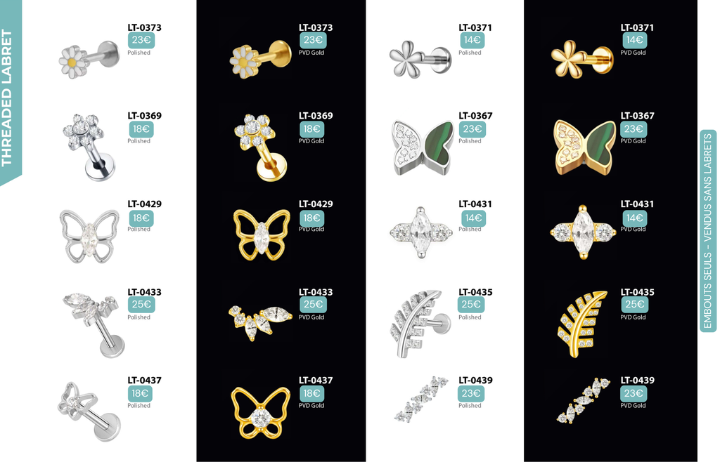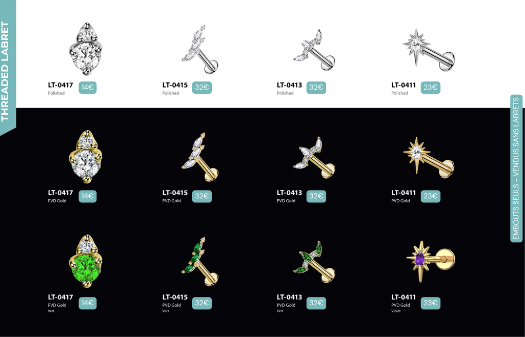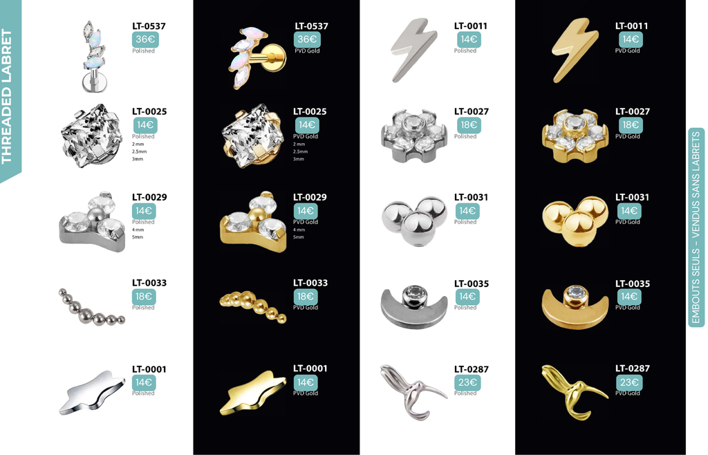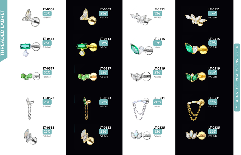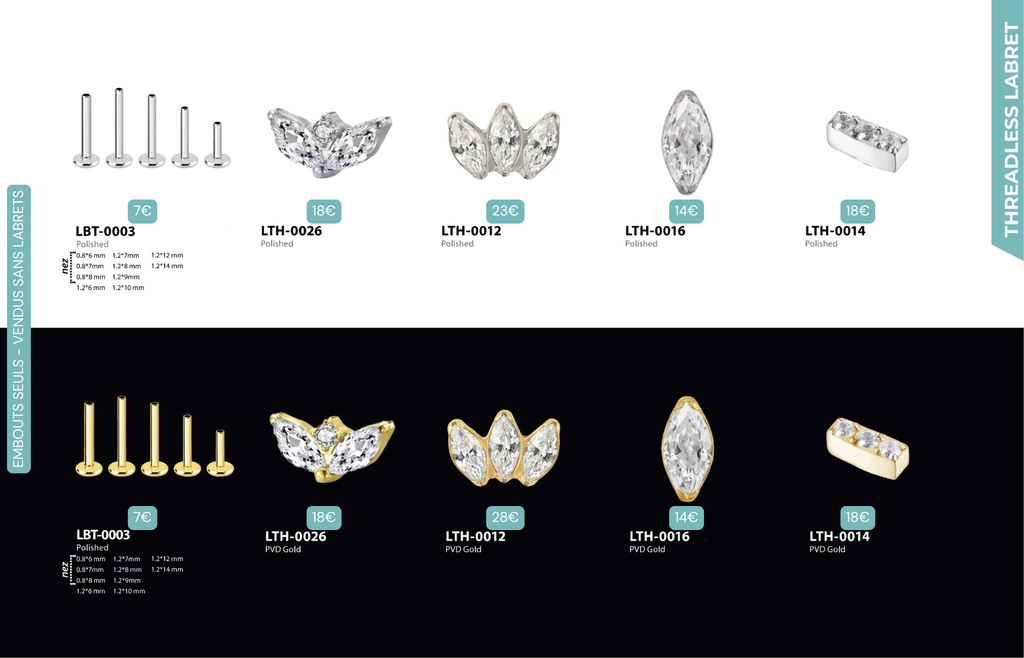 Threaded Labret & Threadless Labret : Compatibles avec Lobes, Low Helix, Mid Helix, Helix, Hidden Helix, Vertical Helix, Anti-Helix, Flat, Tragus, Conch, Rook, Outer Conch, Faux Rook, Faux Anti-Tragus, Narine, Madonna, Monroe, Labret, Medusa, Ashley.