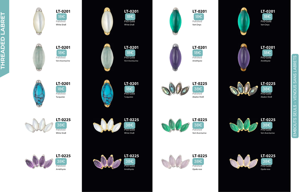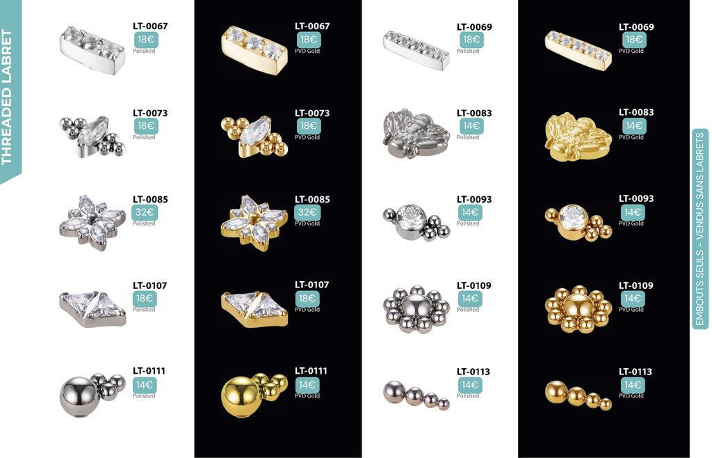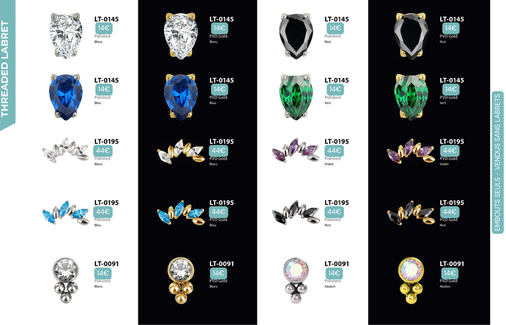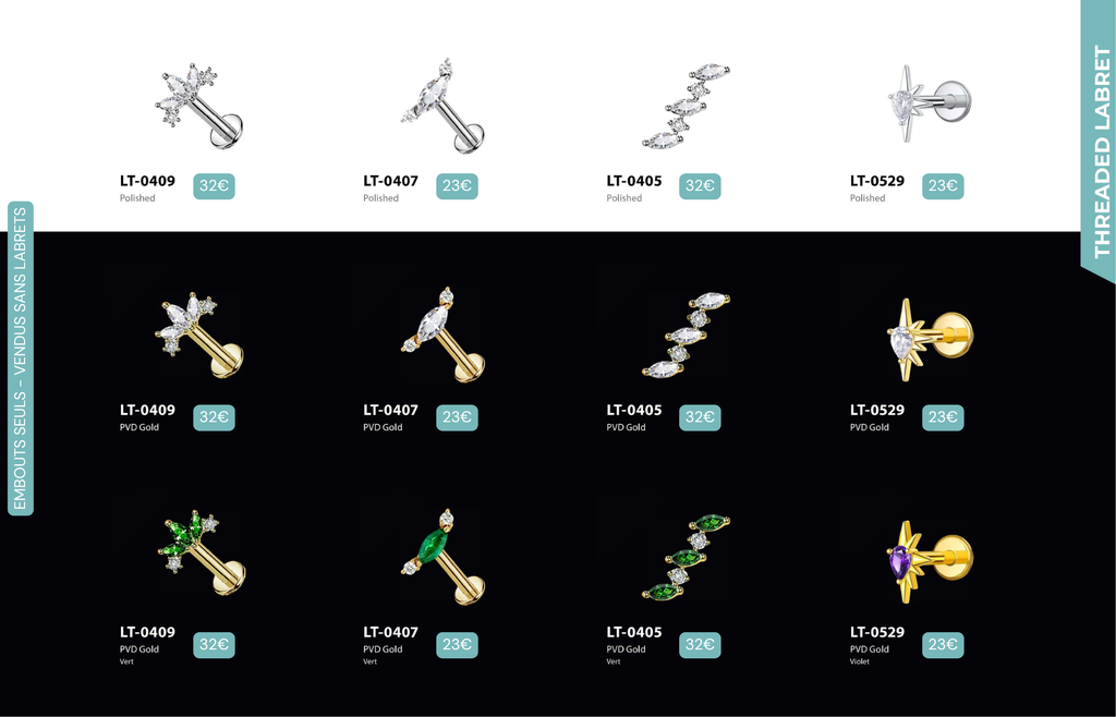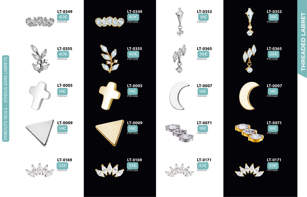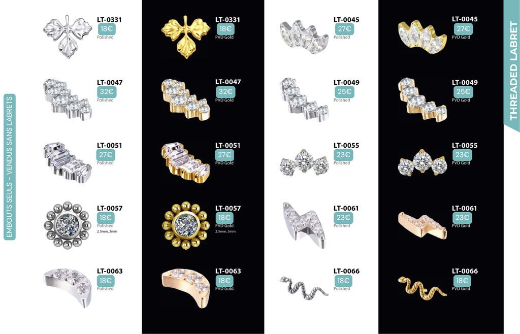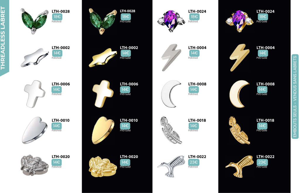Threaded Labret & Threadless Labret : Compatibles avec Lobes, Low Helix, Mid Helix, Helix, Hidden Helix, Vertical Helix, Anti-Helix, Flat, Tragus, Conch, Rook, Outer Conch, Faux Rook, Faux Anti-Tragus, Narine, Madonna, Monroe, Labret, Medusa, Ashley.