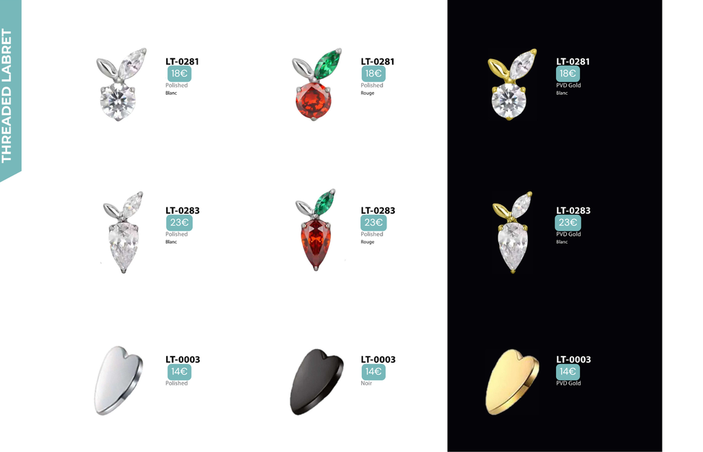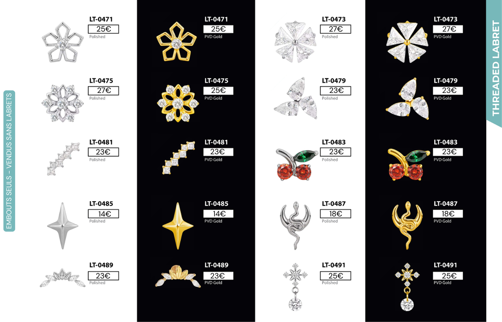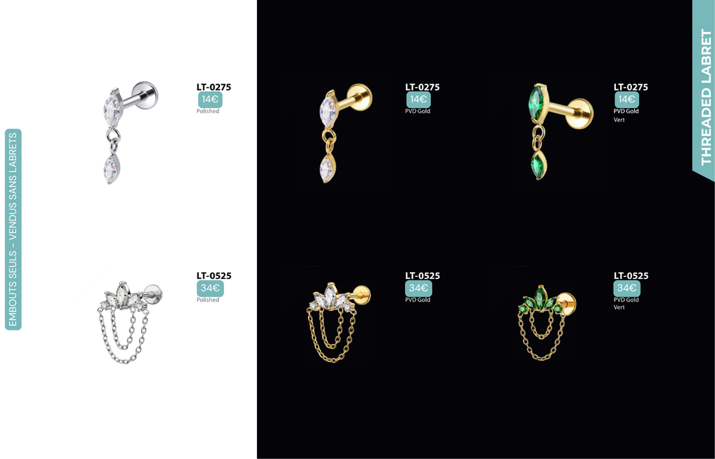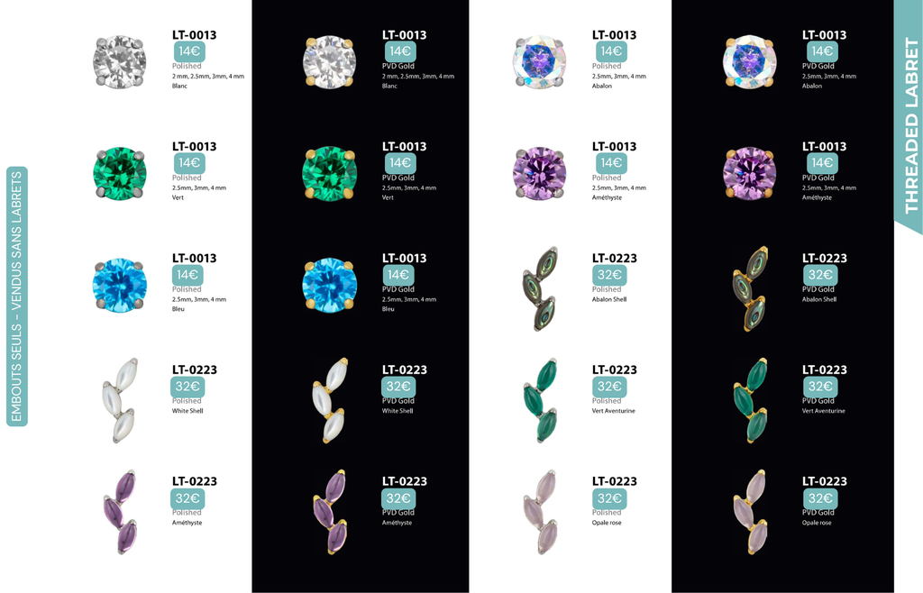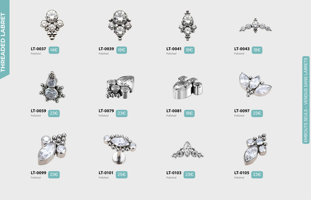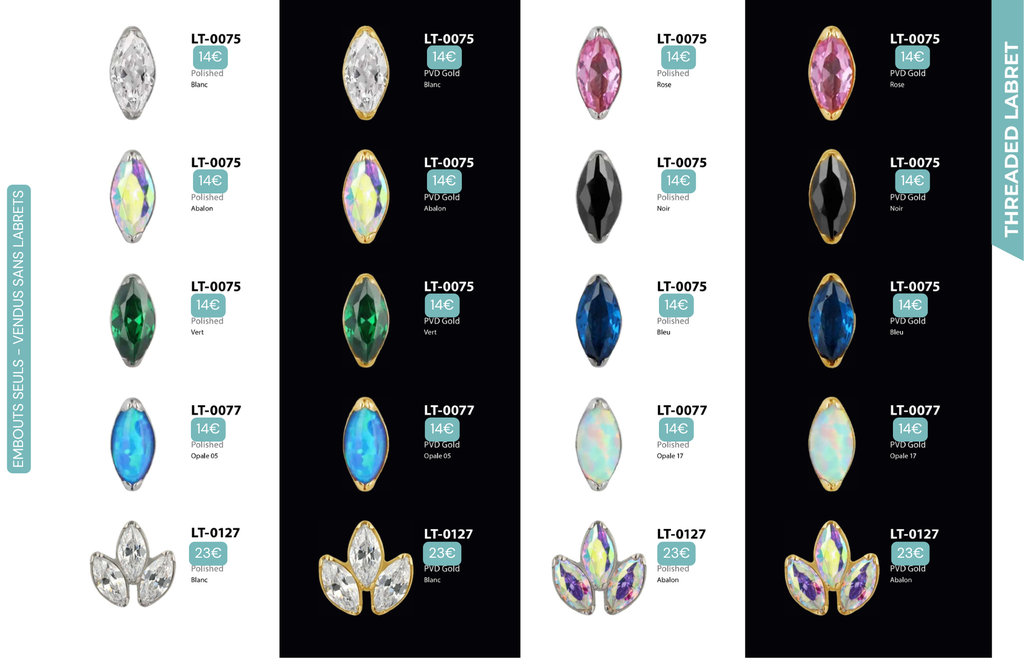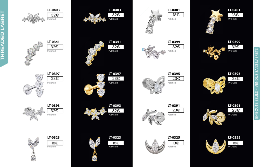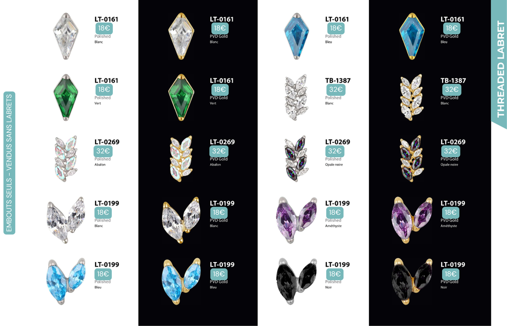 Threaded Labret & Threadless Labret : Compatibles avec Lobes, Low Helix, Mid Helix, Helix, Hidden Helix, Vertical Helix, Anti-Helix, Flat, Tragus, Conch, Rook, Outer Conch, Faux Rook, Faux Anti-Tragus, Narine, Madonna, Monroe, Labret, Medusa, Ashley.