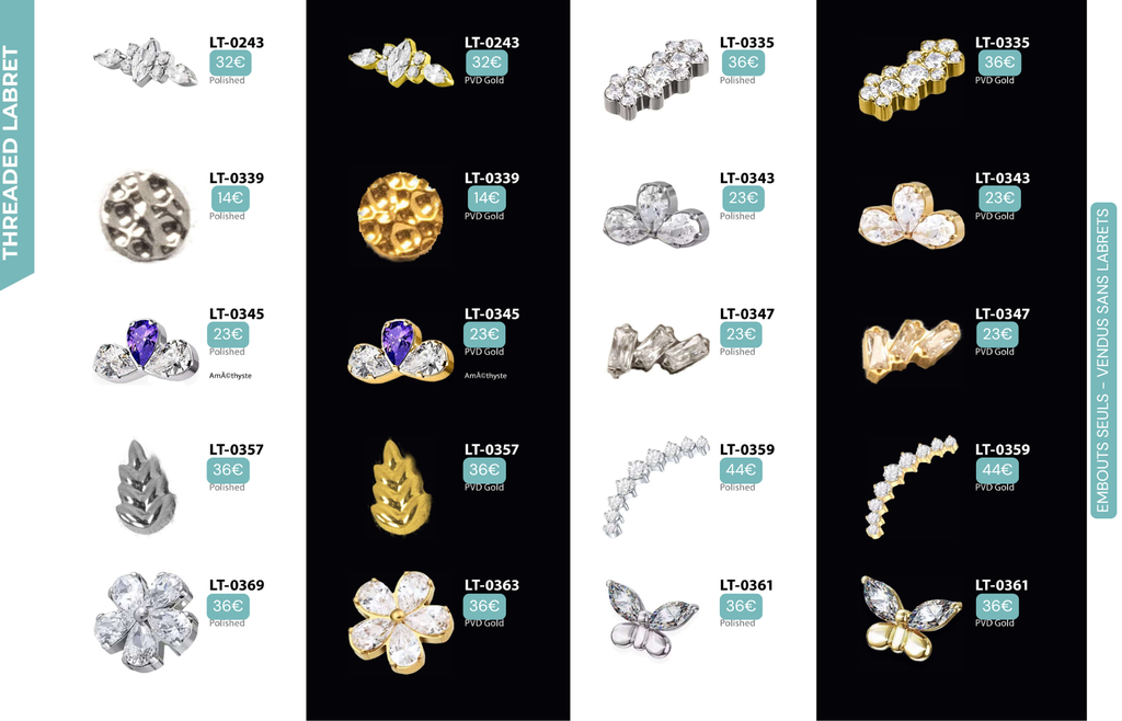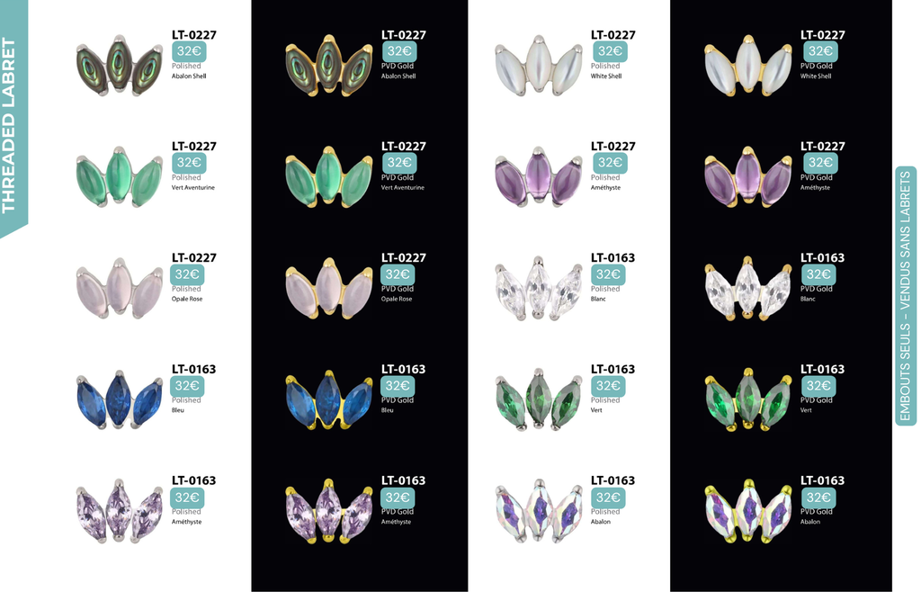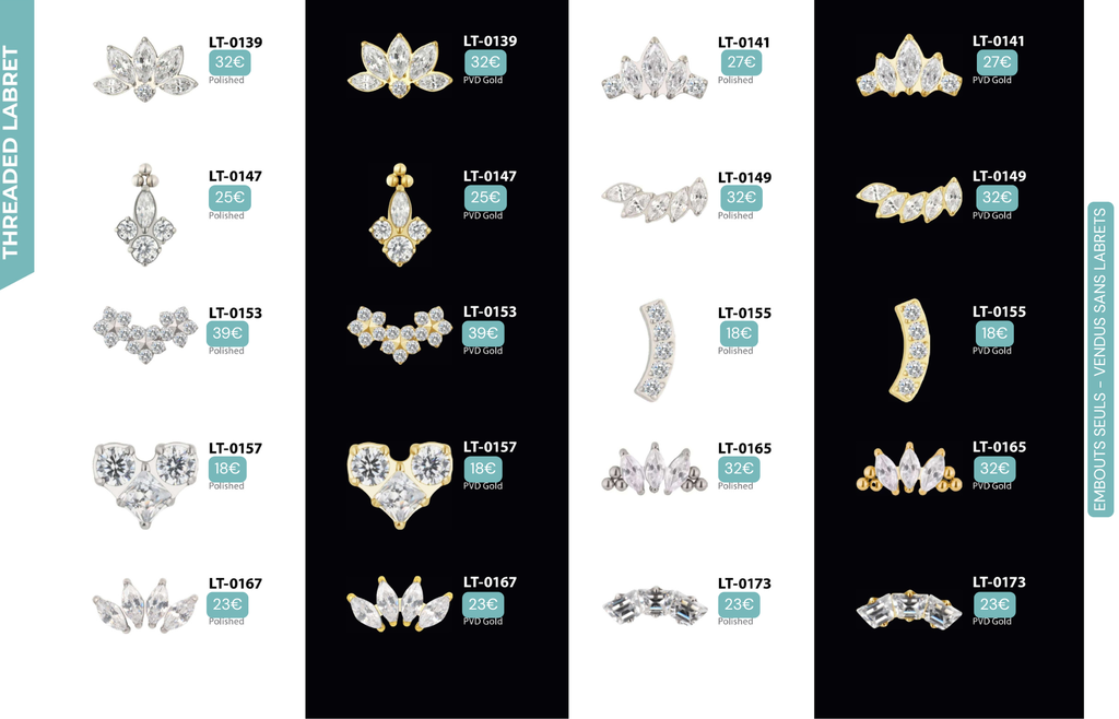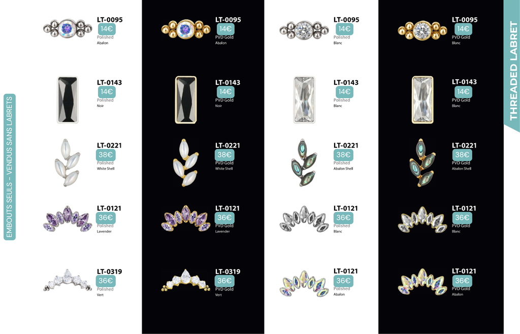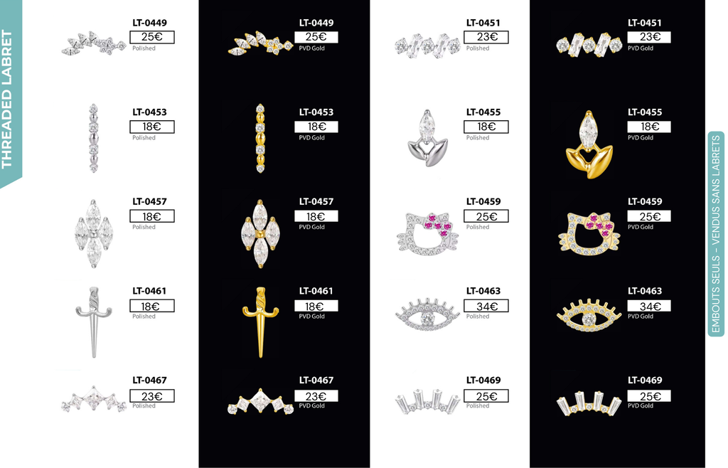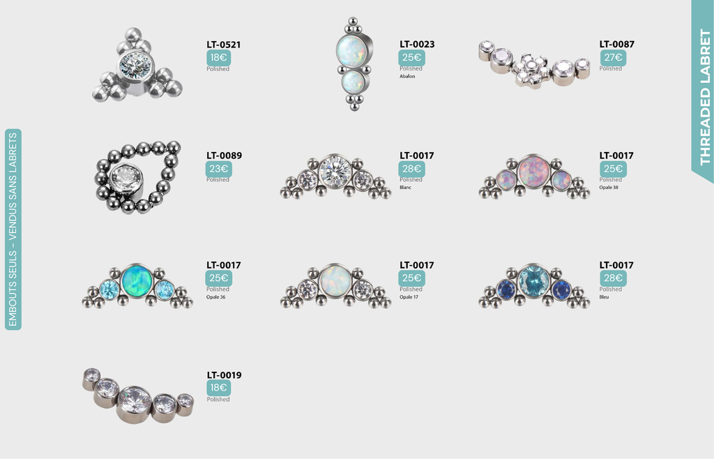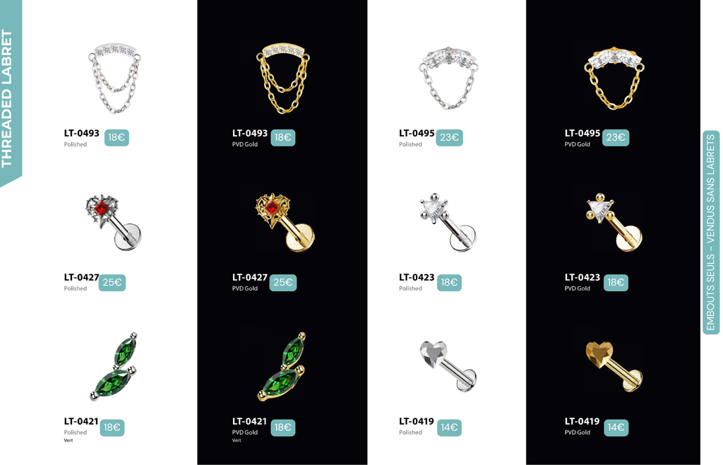 Threaded Labret & Threadless Labret : Compatibles avec Lobes, Low Helix, Mid Helix, Helix, Hidden Helix, Vertical Helix, Anti-Helix, Flat, Tragus, Conch, Rook, Outer Conch, Faux Rook, Faux Anti-Tragus, Narine, Madonna, Monroe, Labret, Medusa, Ashley.