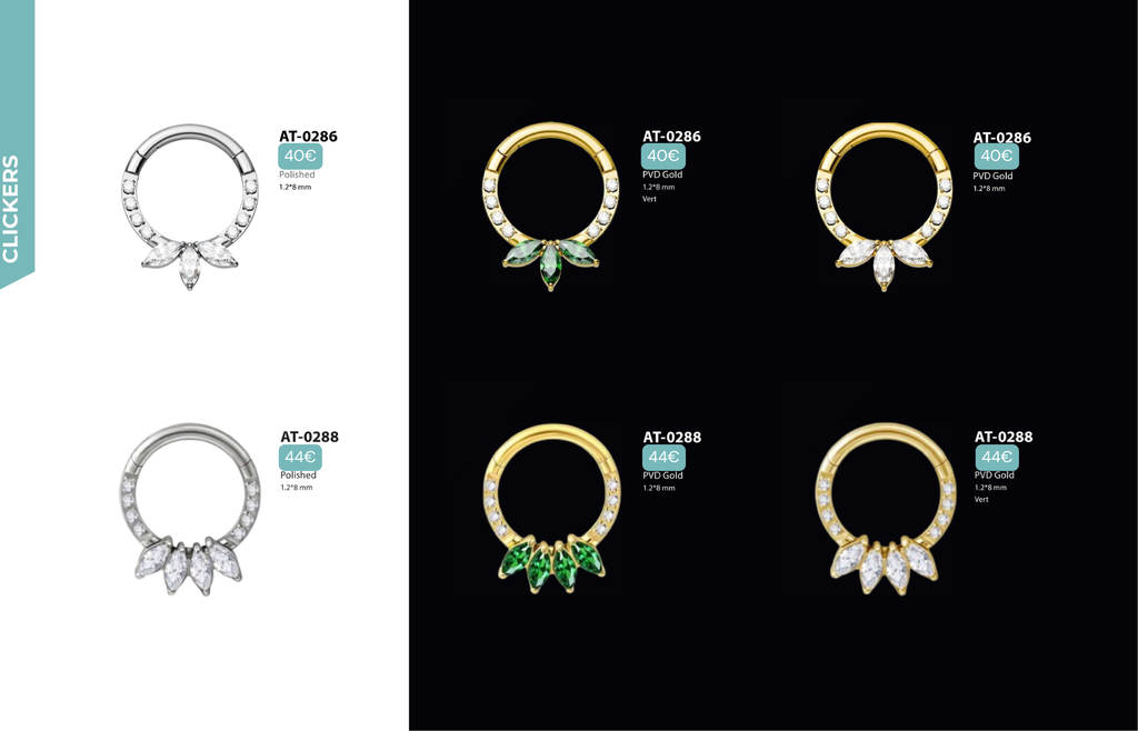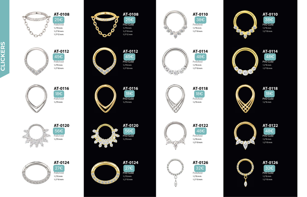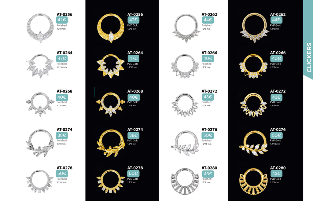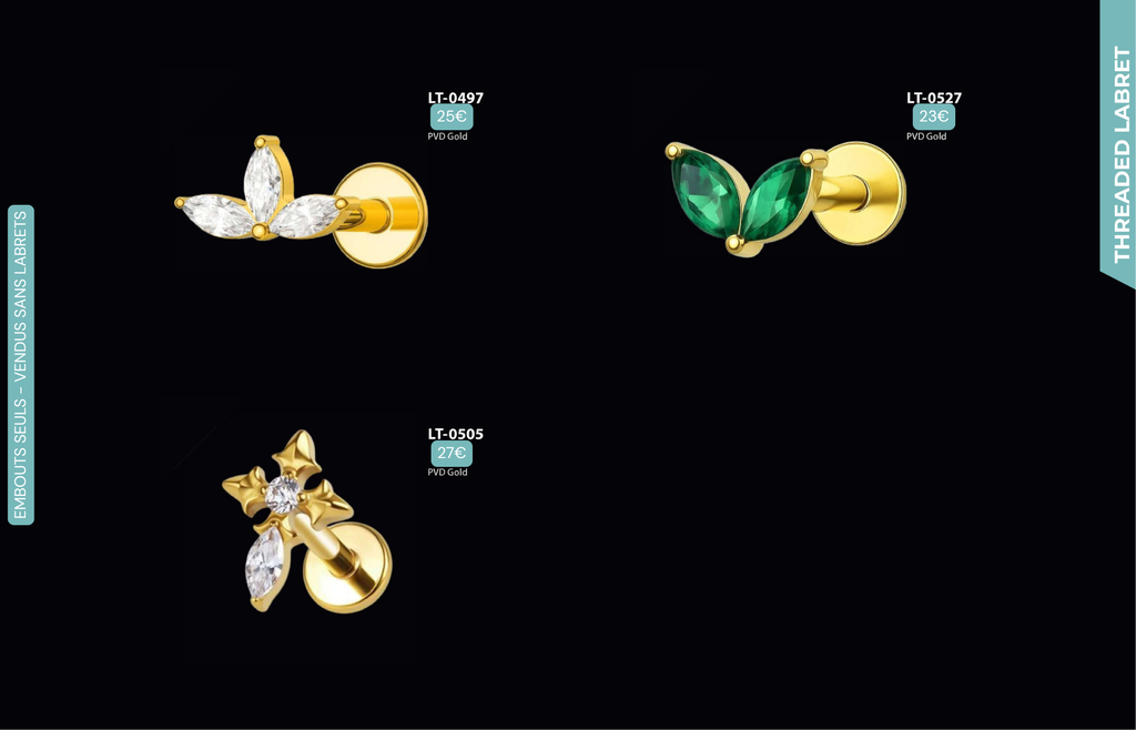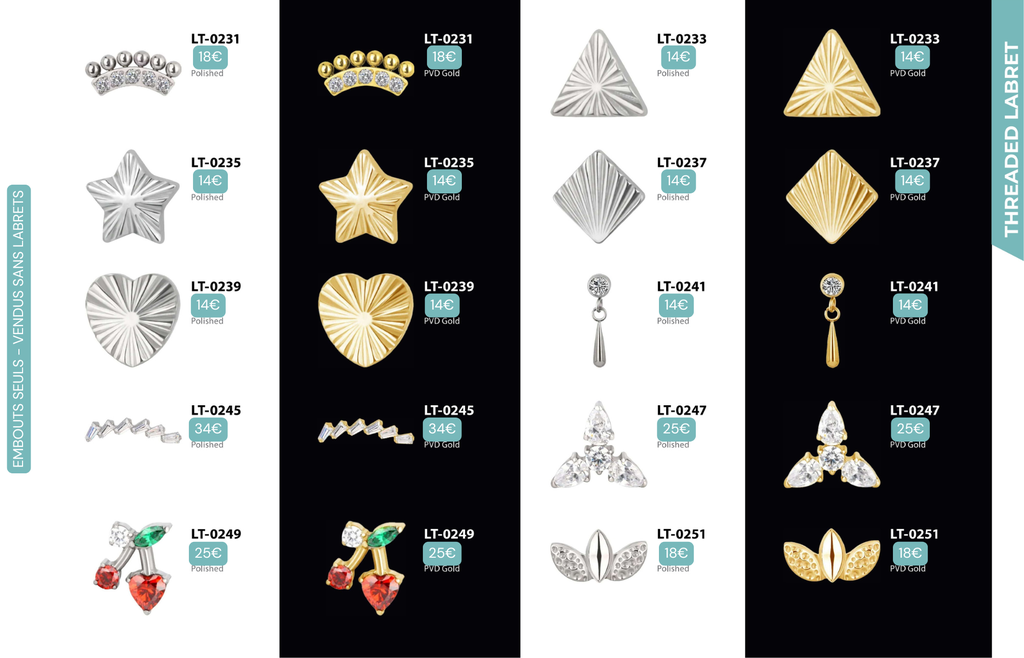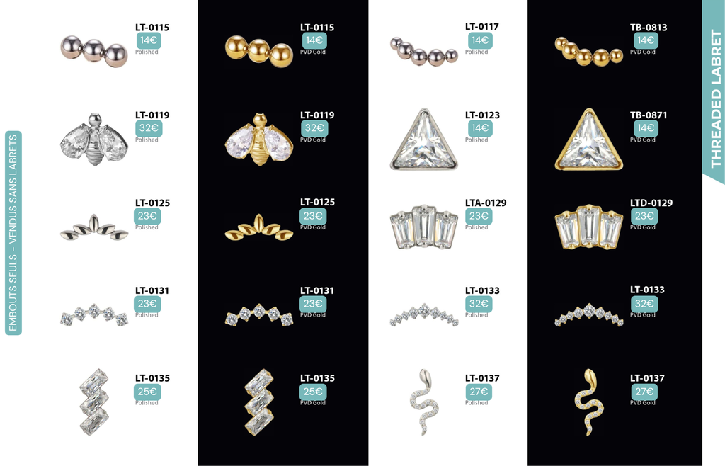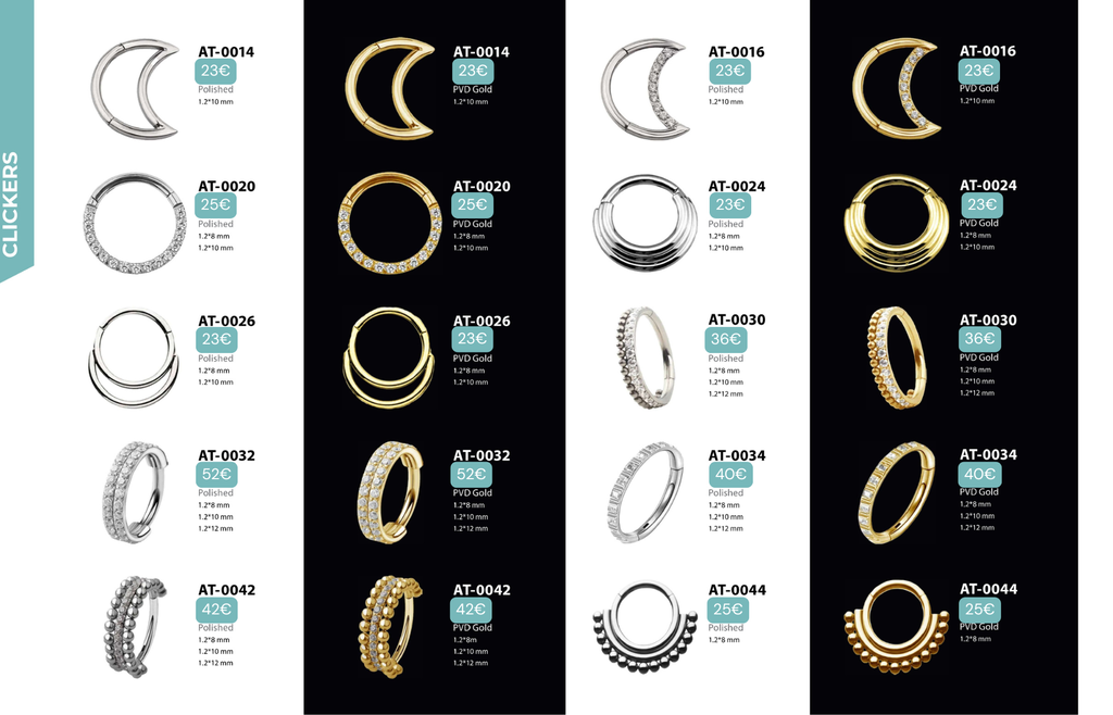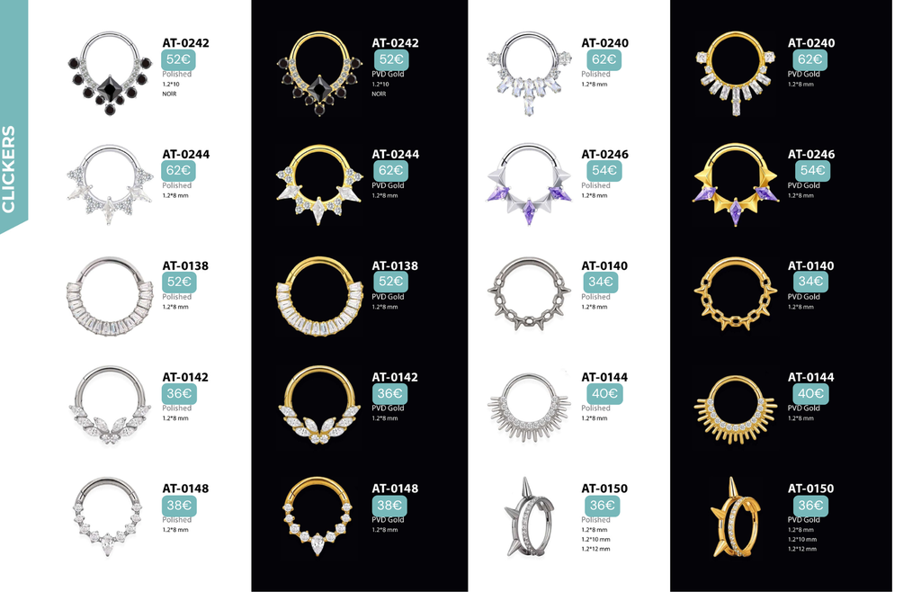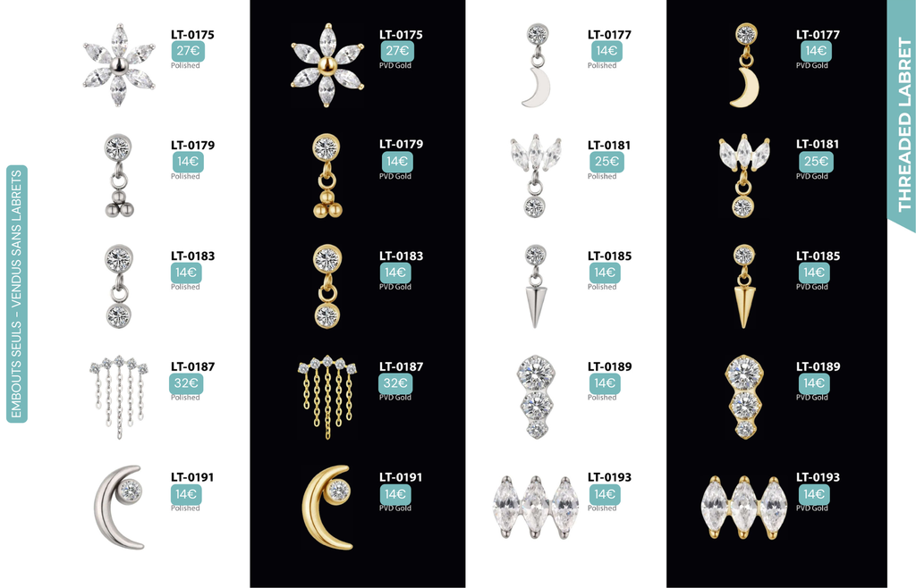 Compatibles avec Lobes, Low Helix, Mid Helix, Helix, Hidden Helix, Vertical Helix, Anti-Helix, Flat, Tragus, Conch, Rook, Outer Conch, Faux Rook, Faux Anti-Tragus, Narine, Madonna, Monroe, Labret, Medusa, Ashley.