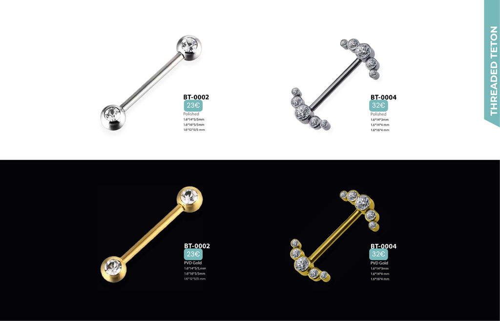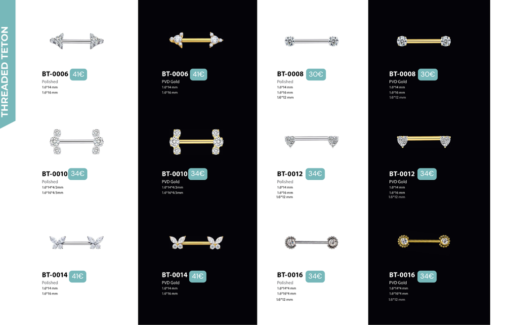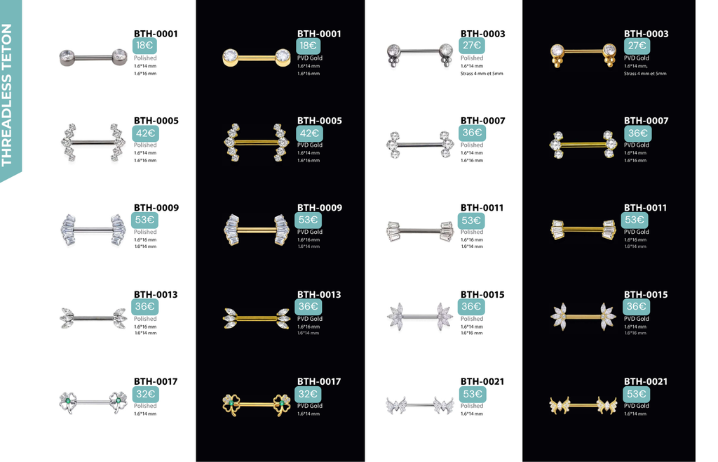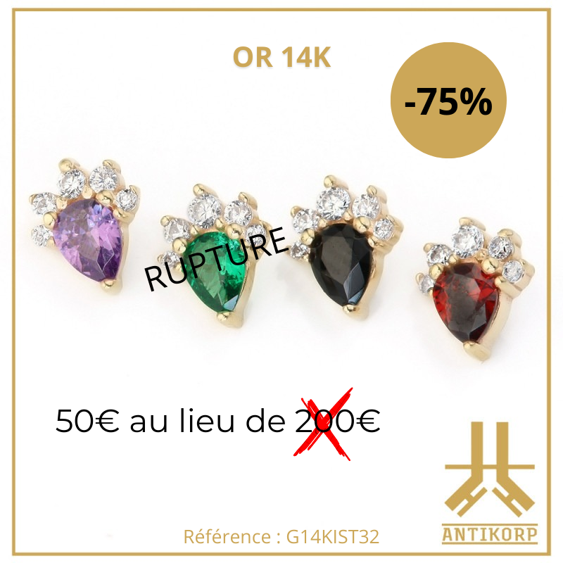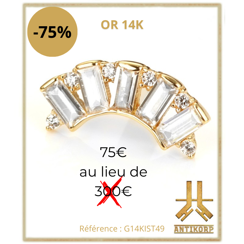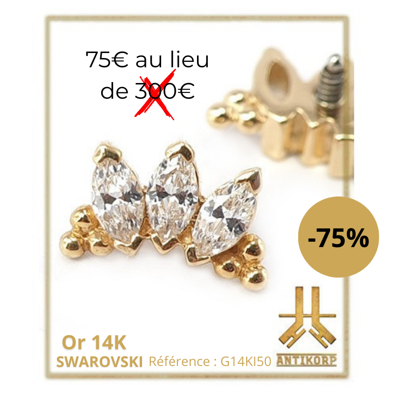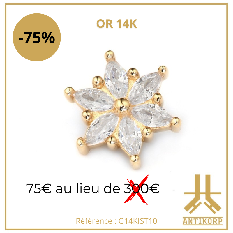 Tous ces bijoux sont en TITANE ASTM F136 : matériau hypoallergénique, biocompatible (réduit les risques de rejet), de grade implantable donc compatible avec les IRM (même matière que celle utilisée dans le corps humain pour des implants médicaux), résiste à la corrosion (eau, transpiration, mer, piscine), favorise une cicatrisation plus rapide, réduit les risques d’infection et d’inflammation, environ 40% plus léger que l’acier chirurgical (plus confortable à porter au quotidien), ultra résistant.