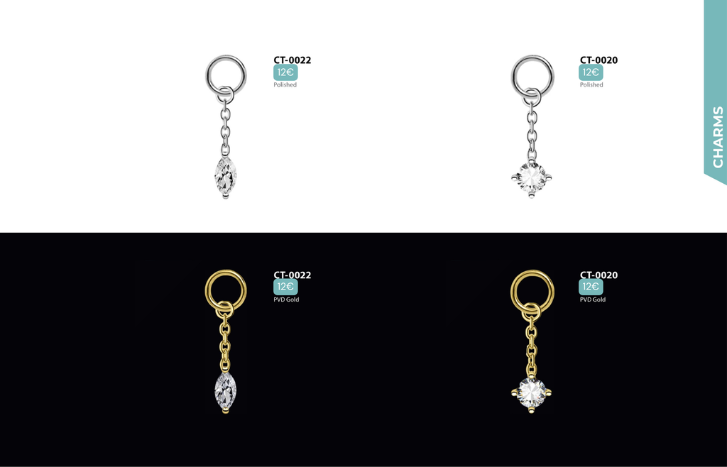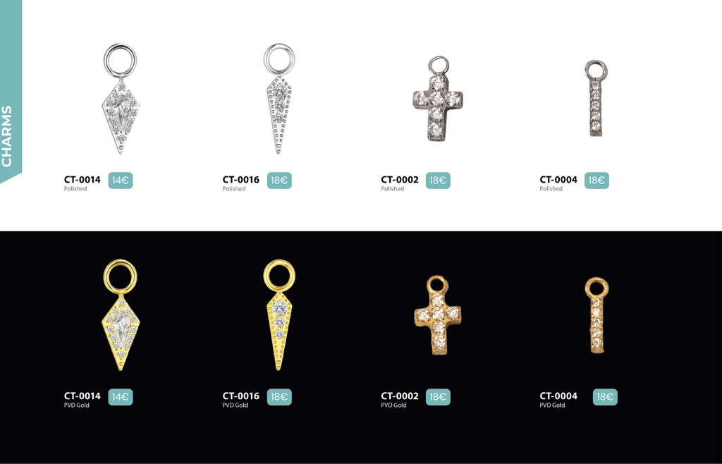 Charms : Compatibles avec Lobes, Low Helix, Mid Helix, Helix, Hidden Helix, Vertical Helix, Anti-Helix, Flat, Tragus, Outer Conch, Faux Rook, Faux Anti-Tragus, Narine, Labret, Medusa, Ashley, Rook, Anti-Tragus, Snug, Arcade, Labret Vertical.